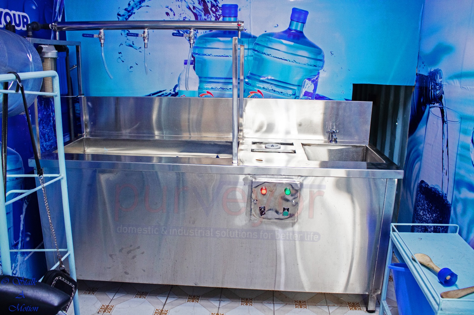 Built in complete bottle rinser with jet rinsing inside of the bottles and sink for washing the outer part of the bottles.